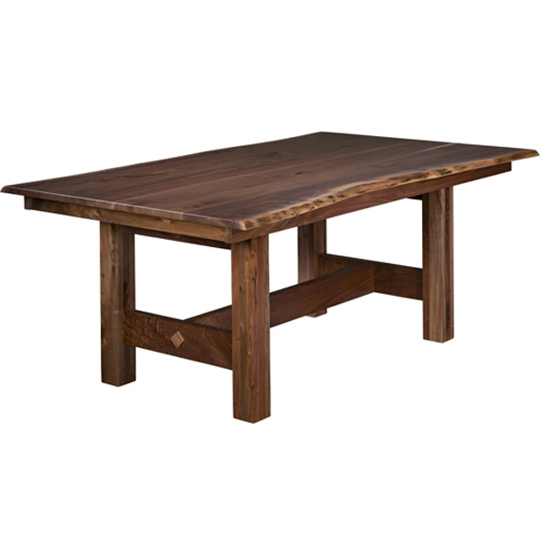 Vintage Live Edge Trestle is shown in Rustic Walnut with natural finish.  Standard 1″ thick top.