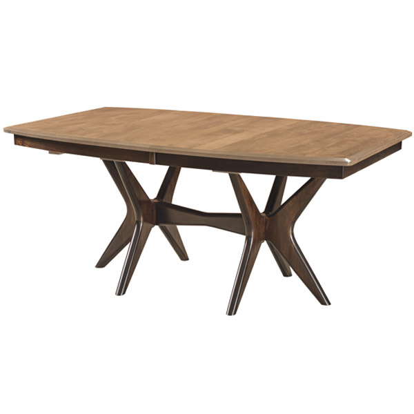 West Newton Trestle Dining Table features a 1″ boat shaped top with beveled edge. Levelers are in the base. Has geared equalizer slides. Most 42″ Wide will store 4 leaves, 2 with skirts and 2 without. 48″ store 4 leaves without skirts. 42 x 60 will only store 2 leaves without skirts. Shown in two tone stain on brown maple. Very unique designed trestle will make an impact in any dining room. This table is priced as a 42×60 solid top in Oak.