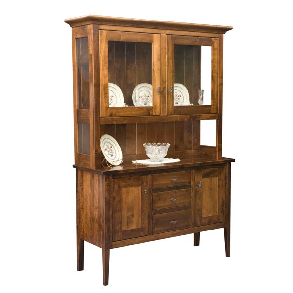 Standard Features: Flush doors with light guard, antique glass doors and sides, open deck, LED lighting, 1 adjustable glass shelf with plate groove in top, adjustable shelf in base, full extension side mount slides, solid shiplap back, dovetail drawer boxes, breadboard top, and European hinges.