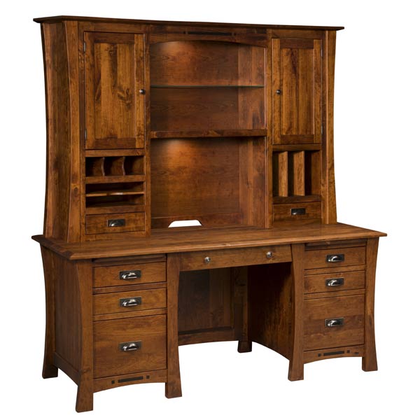 Arts & Crafts Desk features 2 file drawers, 2 storage drawers on each side, unfinished back, ebony inlays in the face frame and a pencil drawer in the knee space.