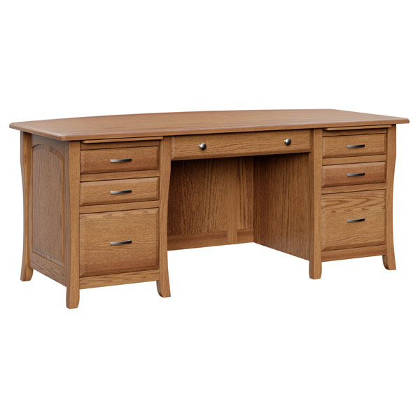 Desk standard has 2 file drawer, 4 storage drawers, keyboard pullout in the knee space with flip down front. 2 pullout writing boards and finished back.