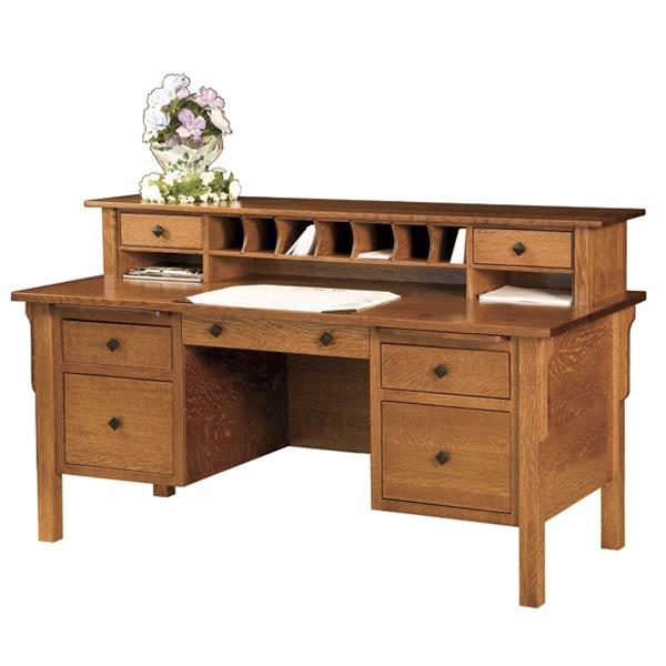 Centennial Desk features 2 file drawers, 2 storage drawers, a pencil drawer, and finished back corbels on the posts. Select your wood type and stain color. Shown with standard hardware, for more options view our hardware catalog.