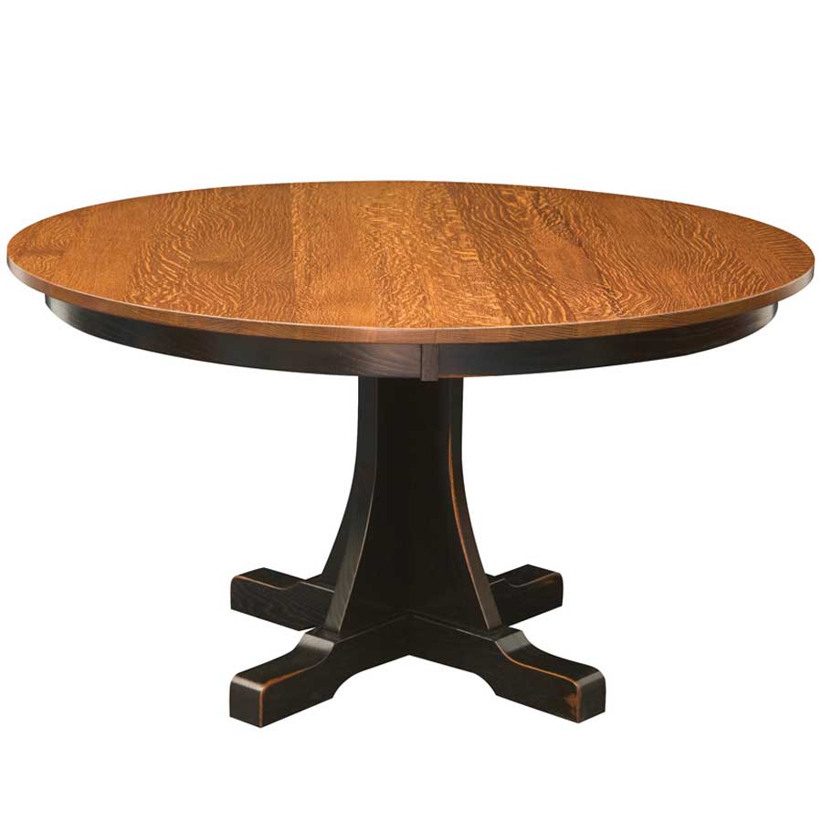 The Ridgewood is a single pedestal table. Shown in Quarter Sawn White Oak with a White Oak base. Choose to do a different stain on the table top and base, this will add color contrast. Has a 1″ thick round top with Mission edge. Base is standard as shown with levelers. Each size can have up to 2 12″ leaves.
