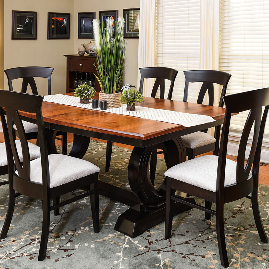 The Saratoga is high contrast dining table. It plays on different shapes, with circles in the base and a rectangle top. Has a 1.25″ thick semi-boat top with standard edge. Base is as shown with levelers. Quarter Sawn White Oak tables will have Quarter Sawn White Oak base. Choose to do a two tone stain, a lighter color on the table top, and darker for the base. Add up to 4 leaves with each size.