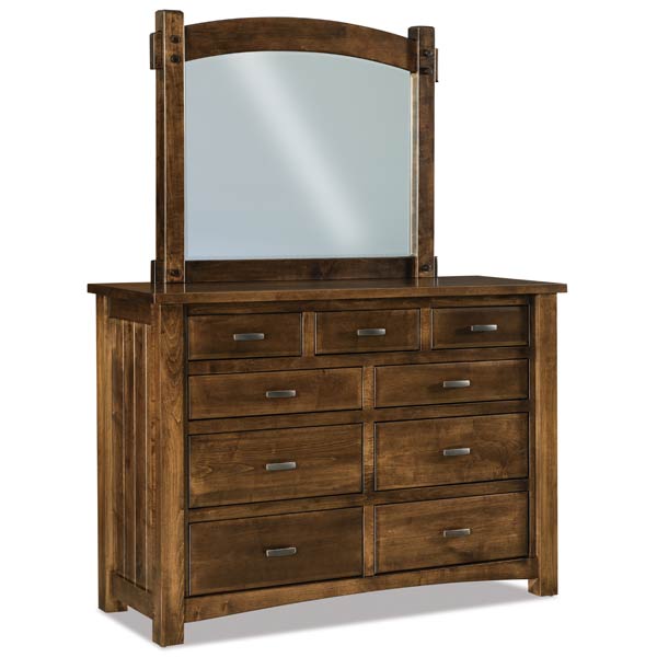Timbra Dresser features 9 drawers for storage.  Shown with optional mirror JRT-030.  Standard features include 1 1/4″ solid wood tops, 3/4″ solid side panels with grooves, 3″ solid wood posts, full extension drawer slides, and solid maple dovetailed drawer boxes.  Upgrade to soft close undermount drawer slides.  Choose to add optional beveled mirror.