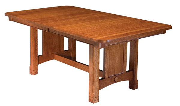 The West Lake trestle table has an option for a double butterfly leaf system. The table is shown in a 42″ x 72″ size in quarter sawn white Oak wood with a 4 inch radius corner and a mission edge. It also has a rope molding detail on the skirts and the trestle base. Standard features include a 1 inch thick top and a geared slide which can accommodate up to four leaves.